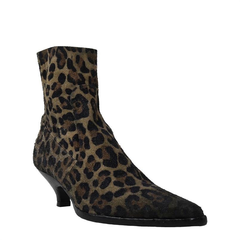 Dames enkel laars van het merk Elena Iachi. De enkel laars is uitgevoerd in panter suede. De ontwerpen van Elena Iachi hebben een geheel eigen stijl, zijn vrouwelijk, elegant en toch stoer. Het binnenwerk is met leer gevoerd, het voetbed van leer en de loopzool is van leer. De hakhoogte meet circa 5 cm. Maatadvies: bestel uw eigen maat.