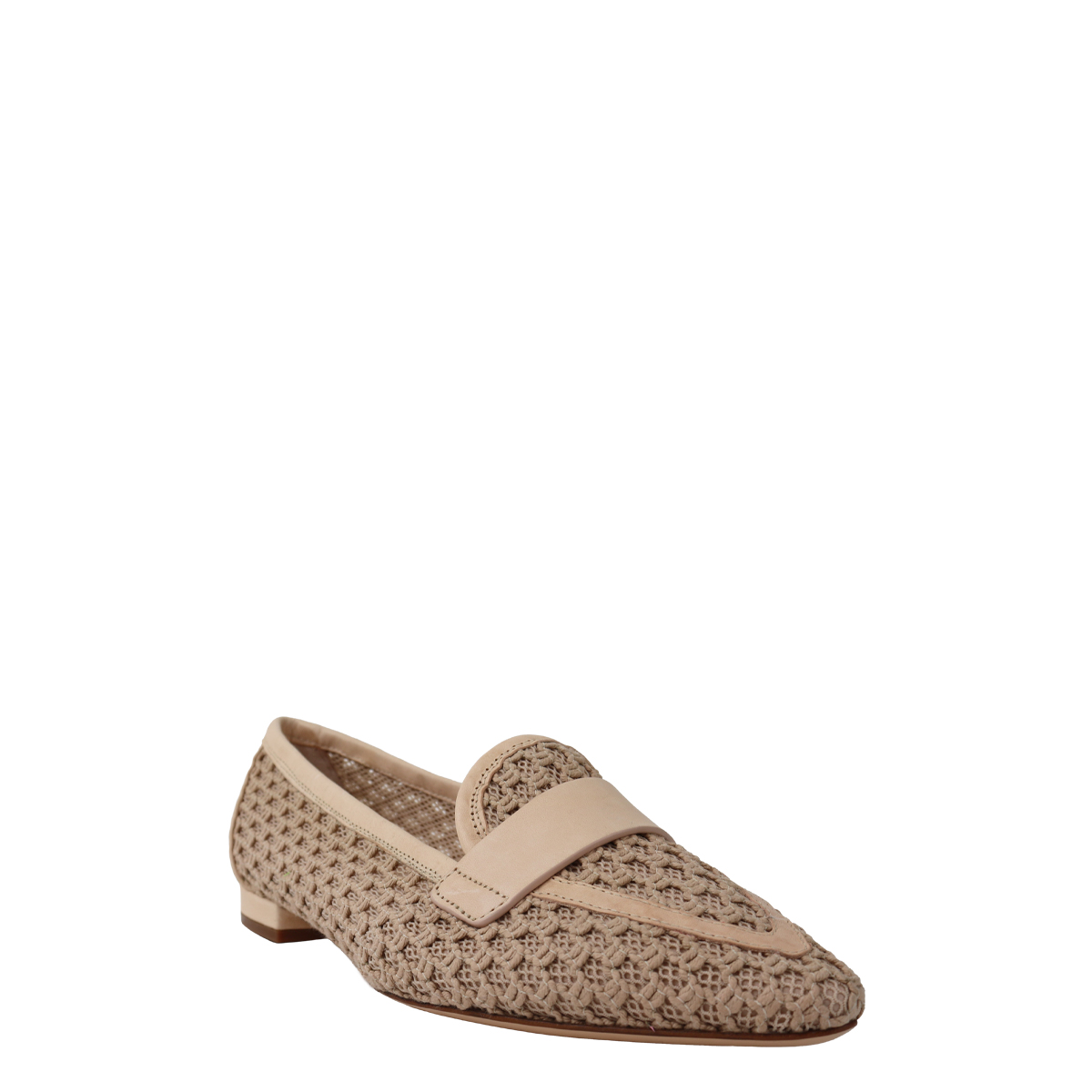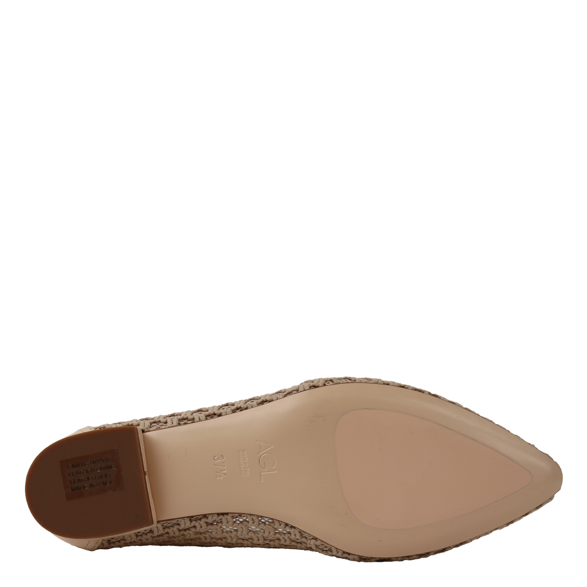 Dames instapper van het merk AGL. De instapper is uitgevoerd in nude stof. Het voetbed is van leer en de loopzool is van leer met een rubber inzet. Maatadvies: bestel uw eigen maat.