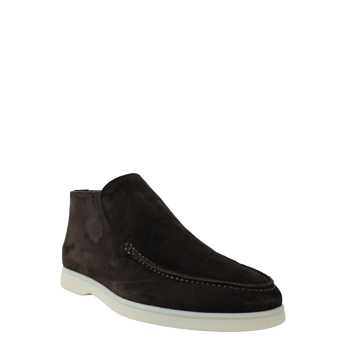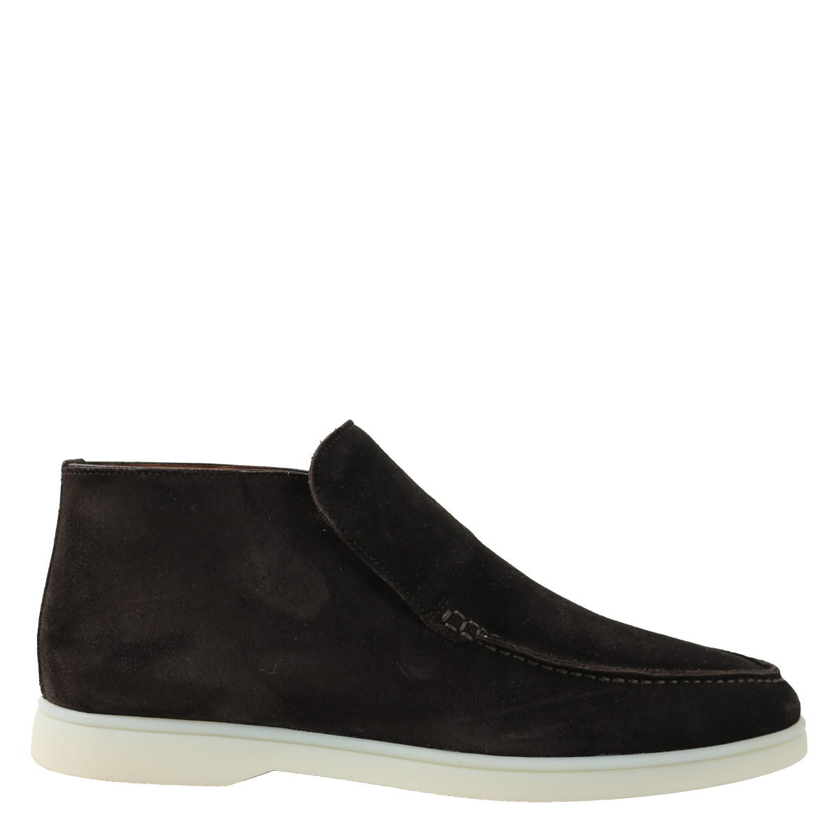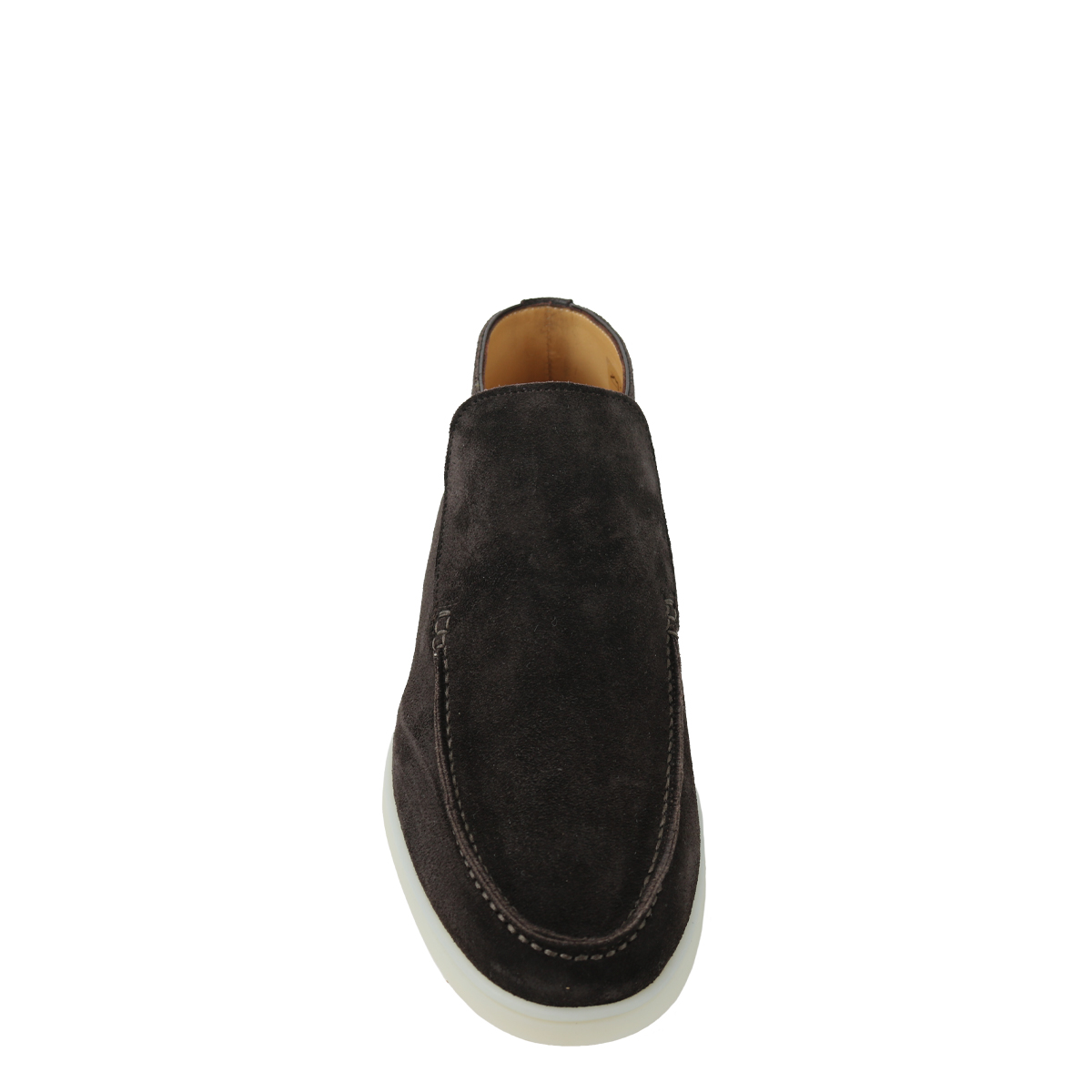 Heren instapper van het merk Aurelien. Deze enkelhoge instapper met lichte zool is uitgevoerd in het donkerbruin suède. De binnenkant is van leer en de loopzool is van rubber. Maatadvies: bestel uw eigen maat.