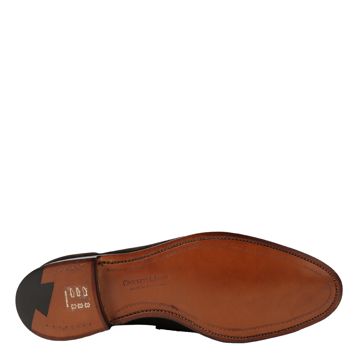 Heren instapper van het merk Crockett & Jones. De instapper is uitgevoerd in donkerbeige suede. De zool is van leer. Maatadvies: bestel uw eigen maat.