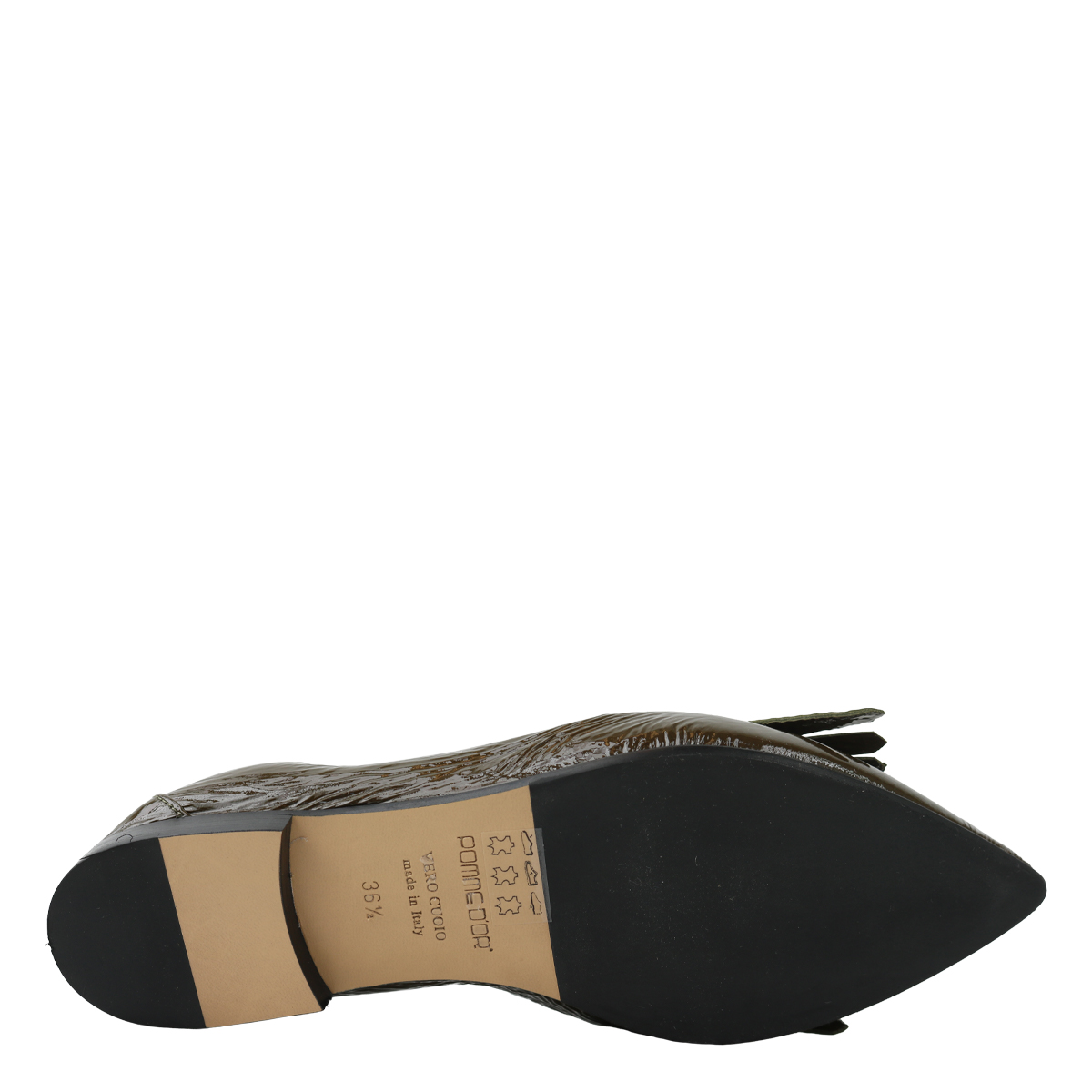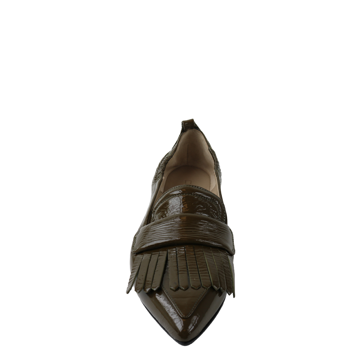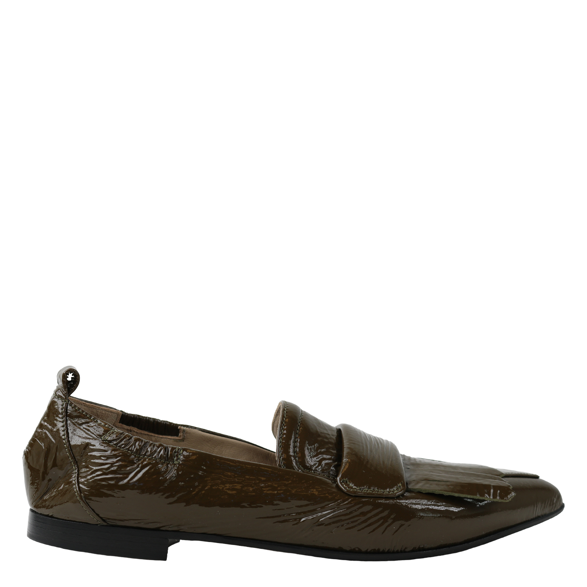 Dames instapper van het merk Pomme D'or. Deze instappers is uitgevoerd in khaky lakleer met franjes aan de voorzijde. De binnenzijde en de zool is uitgevoerd in leer met een rubberen inzet. Maatadvies: bestel uw eigen maat.