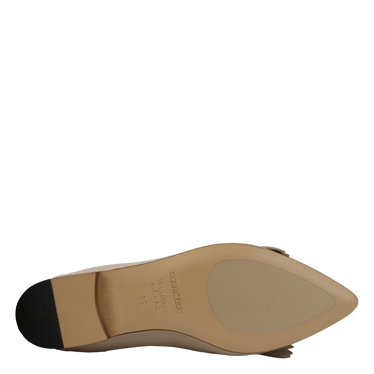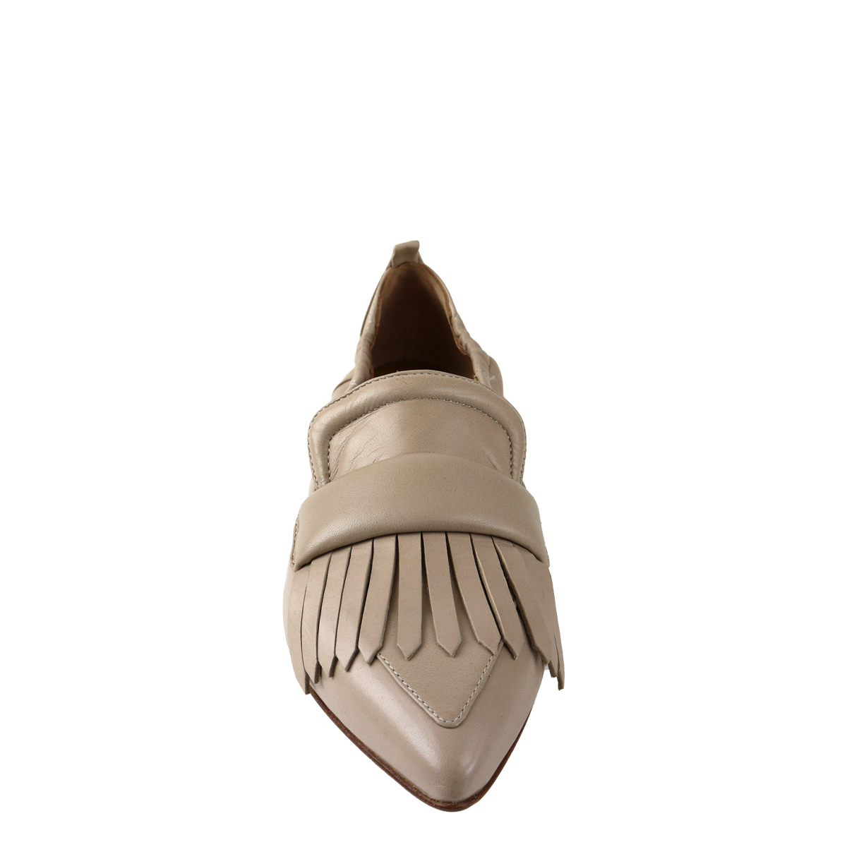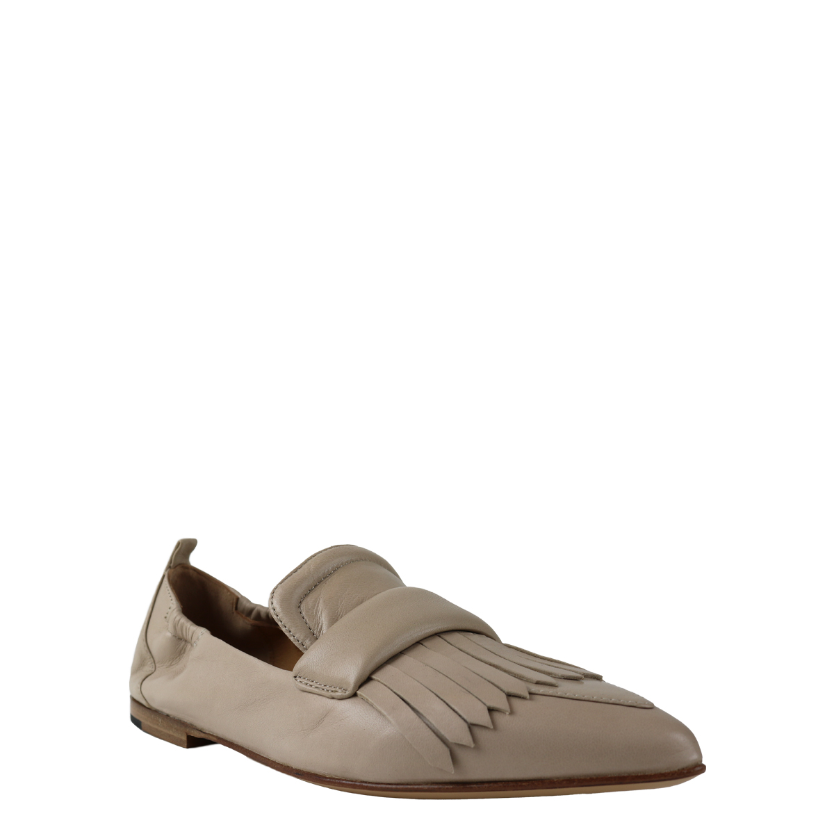 Dames instapper van het merk Pomme D'or. Deze instappers is uitgevoerd in taupe leer met franjes aan de voorzijde. De binnenzijde en de zool is uitgevoerd in leer met een rubberen inzet. Maatadvies: bestel uw eigen maat.