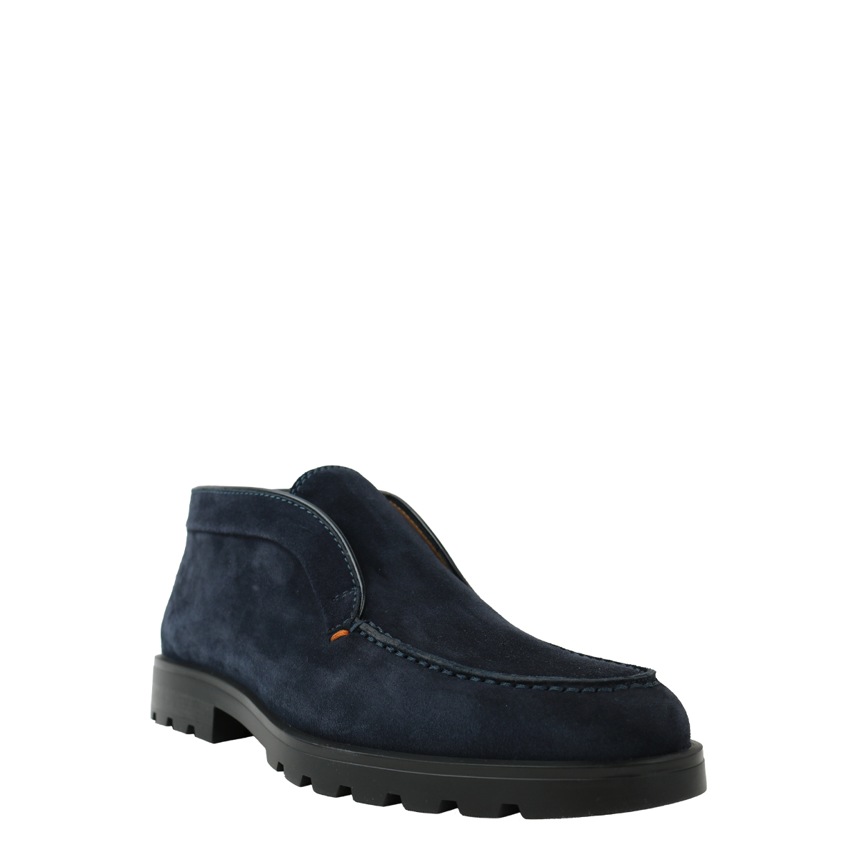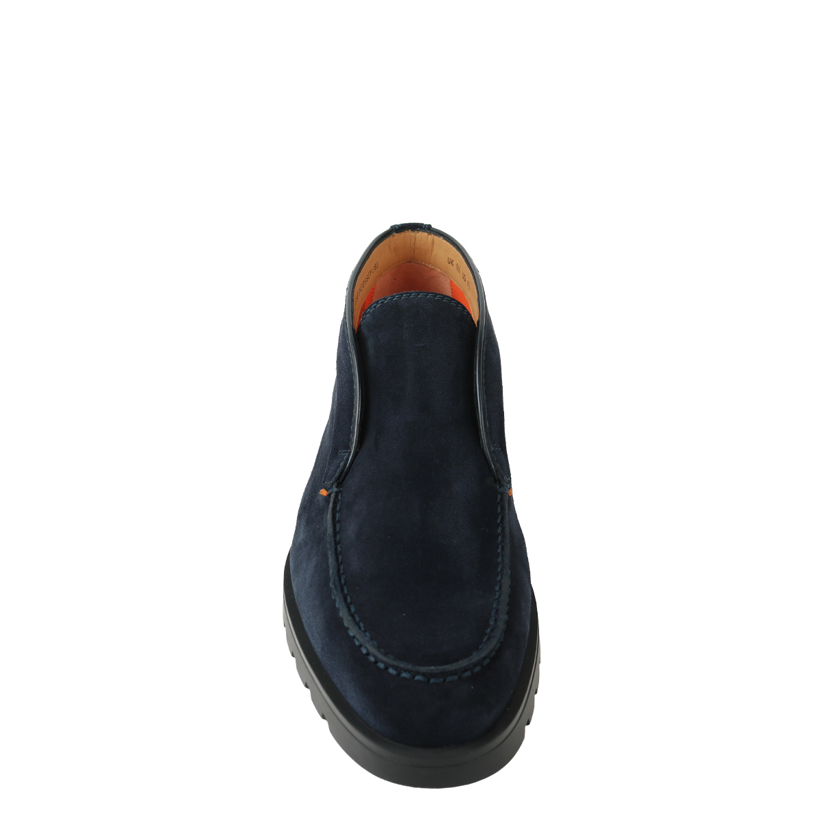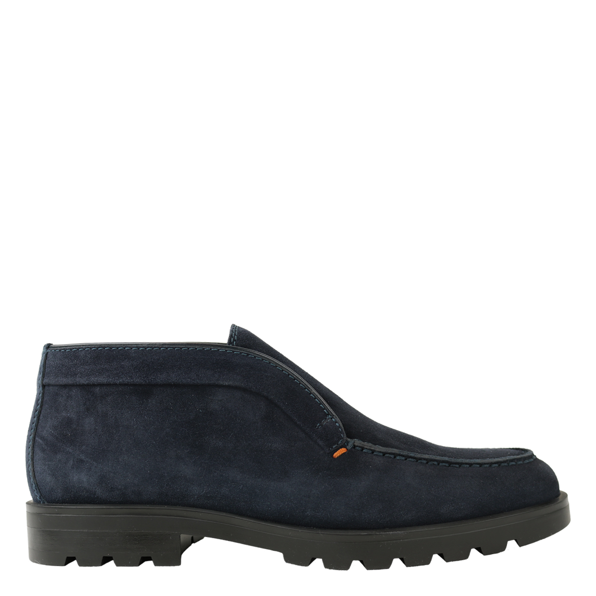 Heren instappers van het Italiaanse merk Santoni. Deze instapper is uitgevoerd in het donkerblauw suede. Santoni is een exclusief merk wat synoniem staat voor luxe, design en handgemaakt vakmanschap. Deze schoen is volledig met leer gevoerd en de loopzool is gemaakt van rubber. Maatadvies: bestel een halve maat kleiner.