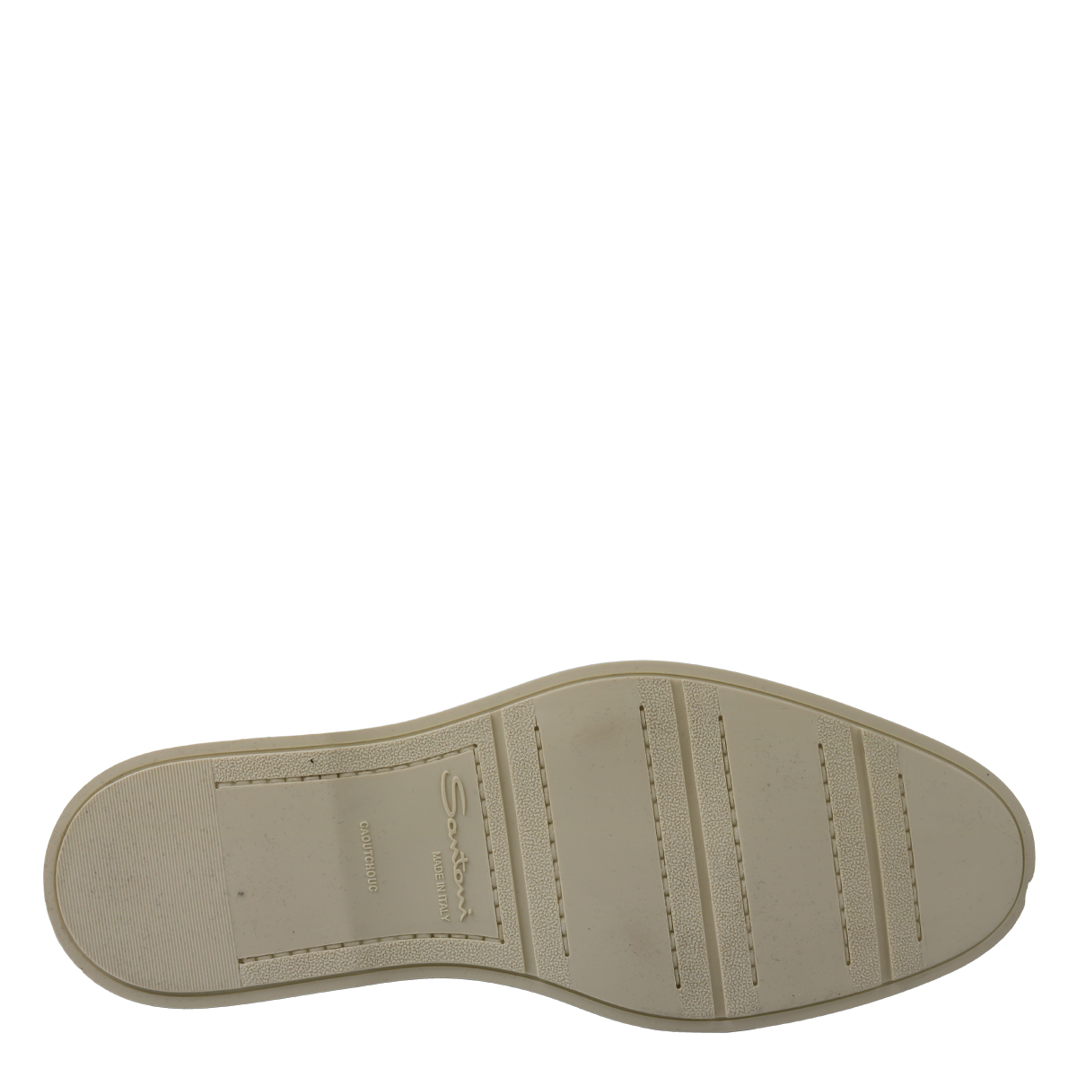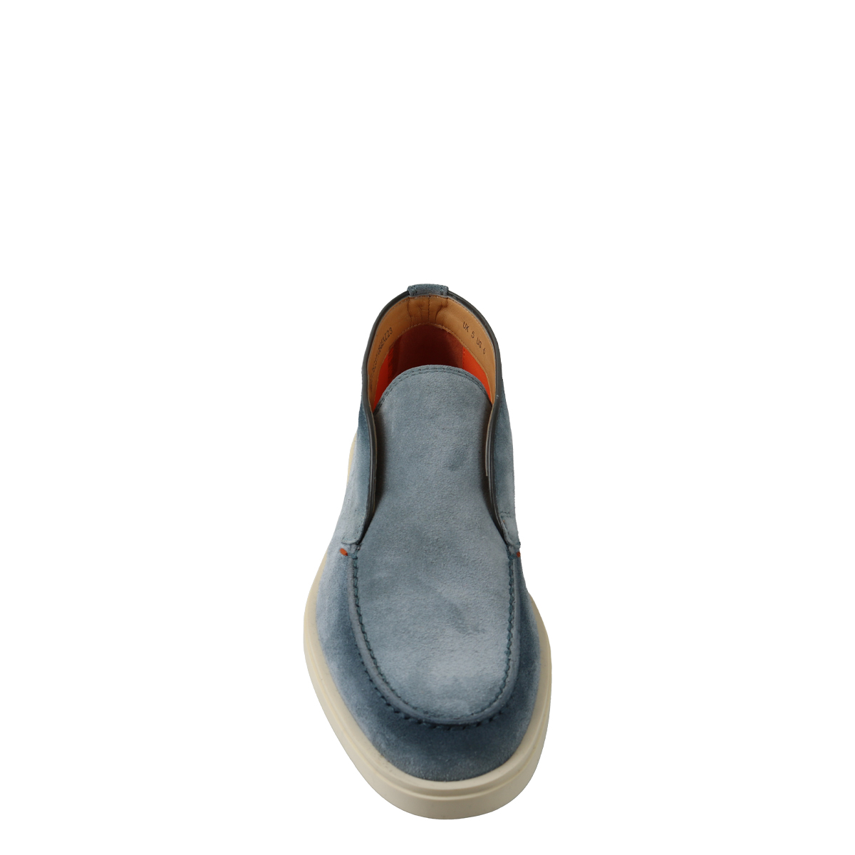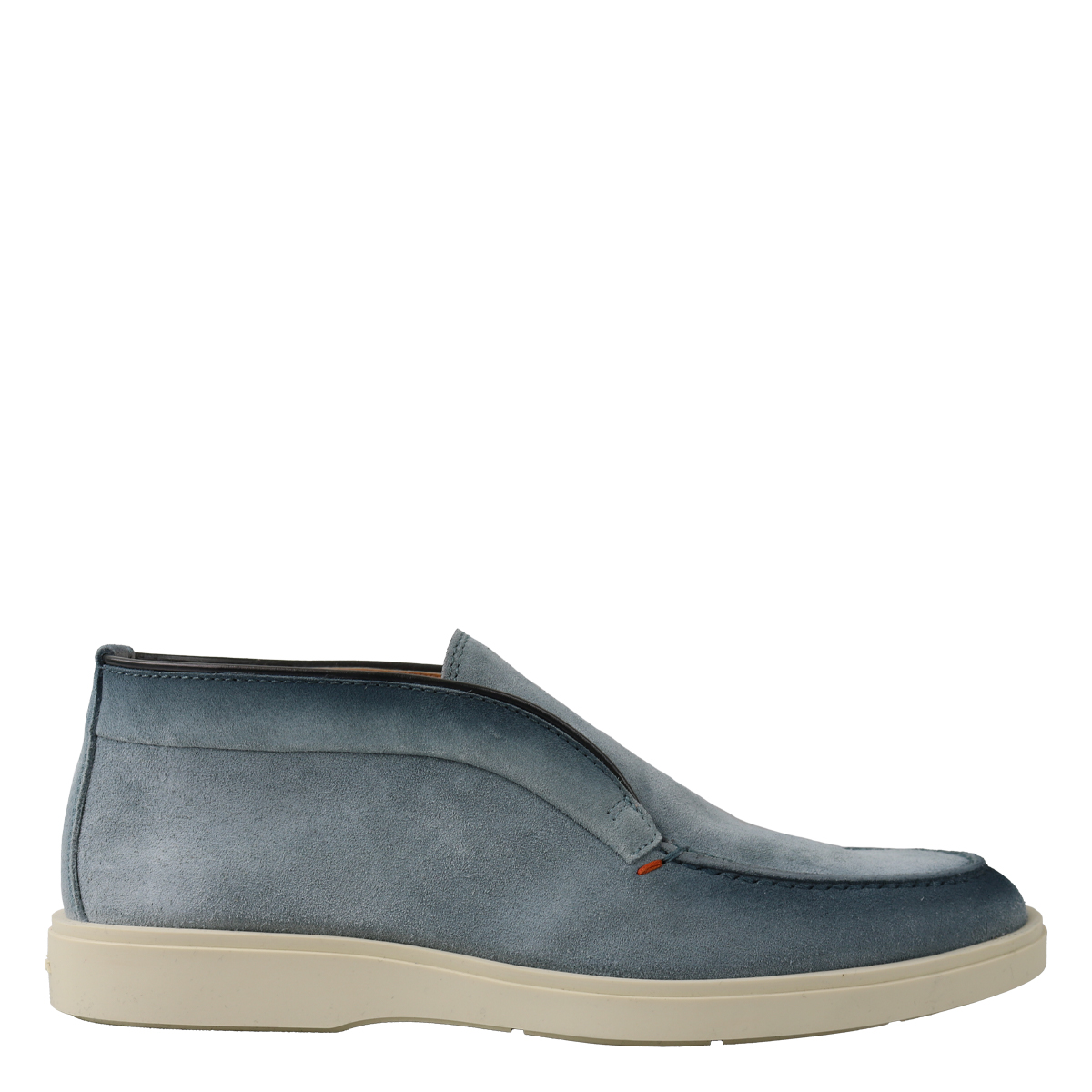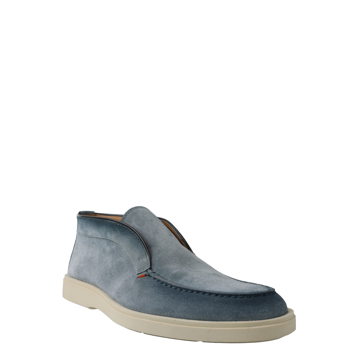 Heren instappers van het Italiaanse merk Santoni. Deze instapper is uitgevoerd in het lichtblauw suede. Santoni is een exclusief merk wat synoniem staat voor luxe, design en handgemaakt vakmanschap. Deze schoen is volledig met leer gevoerd en de loopzool is gemaakt van rubber voor extra grip. Maatadvies: bestel een halve maat kleiner.
