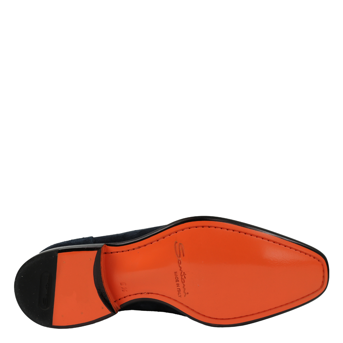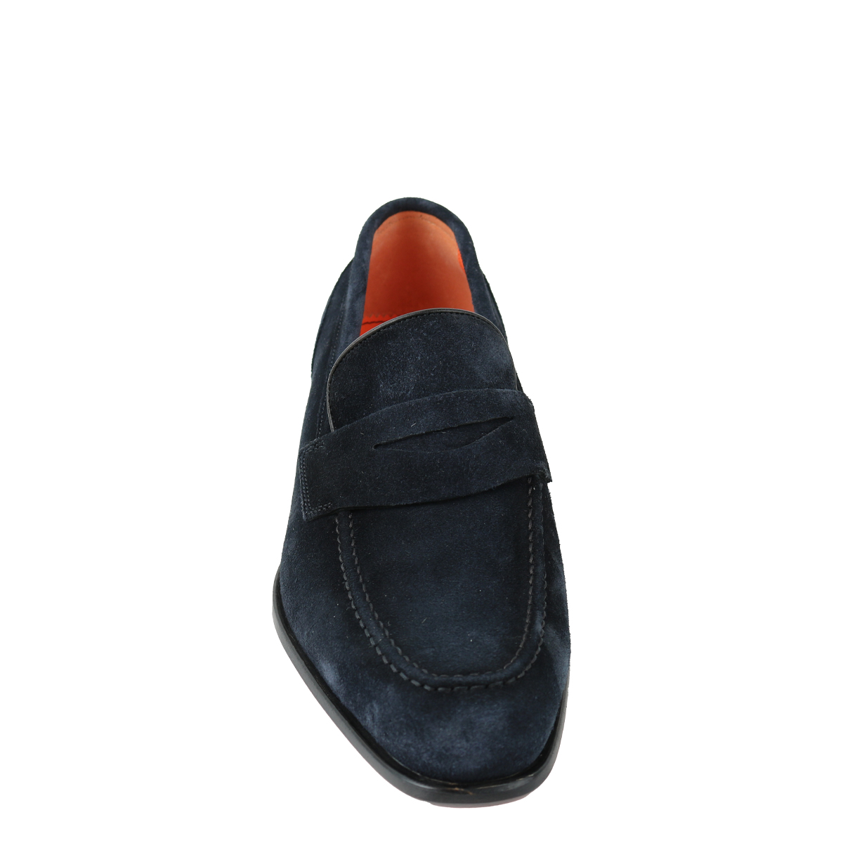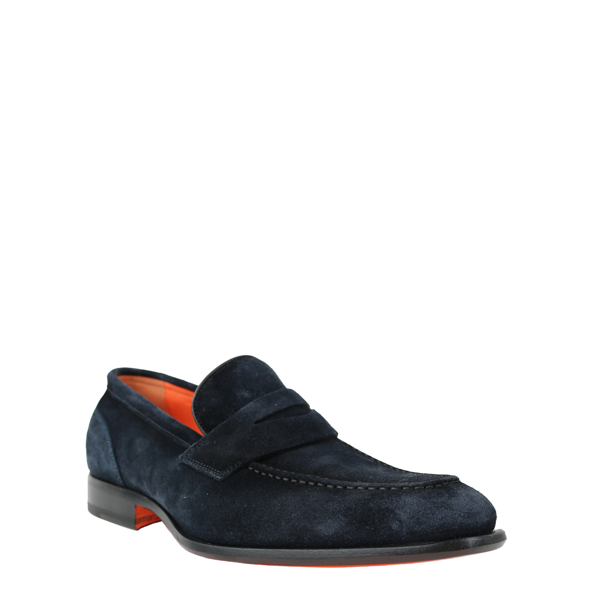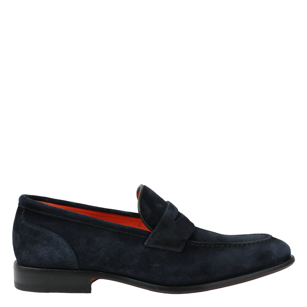 Heren instapper van het Italiaanse merk Santoni. Deze instapper is uitgevoerd in donkerblauw gewassen suede. Santoni is een exclusief merk wat synoniem staat voor luxe, design en handgemaakt vakmanschap. Deze instapper is volledig met leer gevoerd. De loopzool is gemaakt van leer. Maatadvies: bestel een halve maat kleiner.