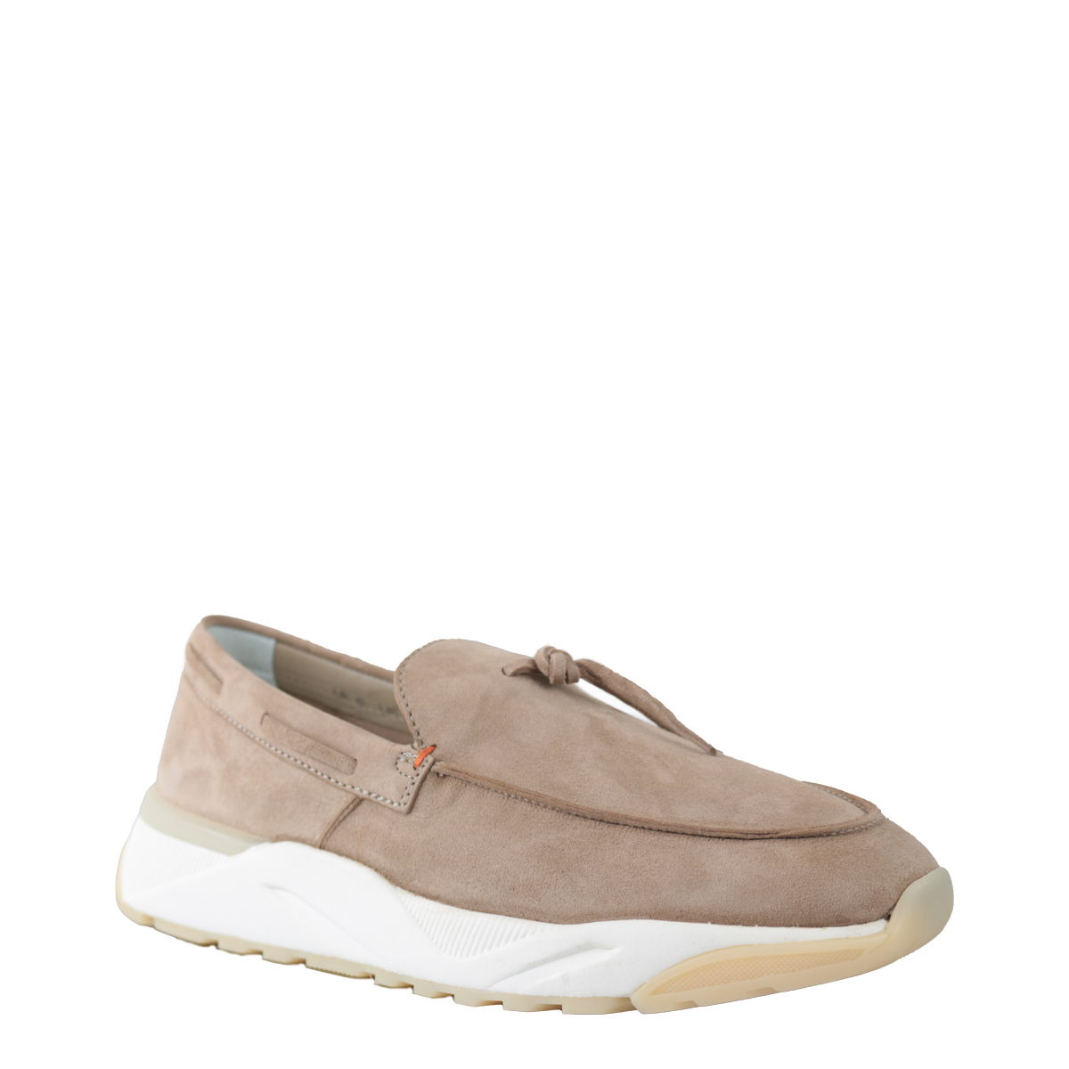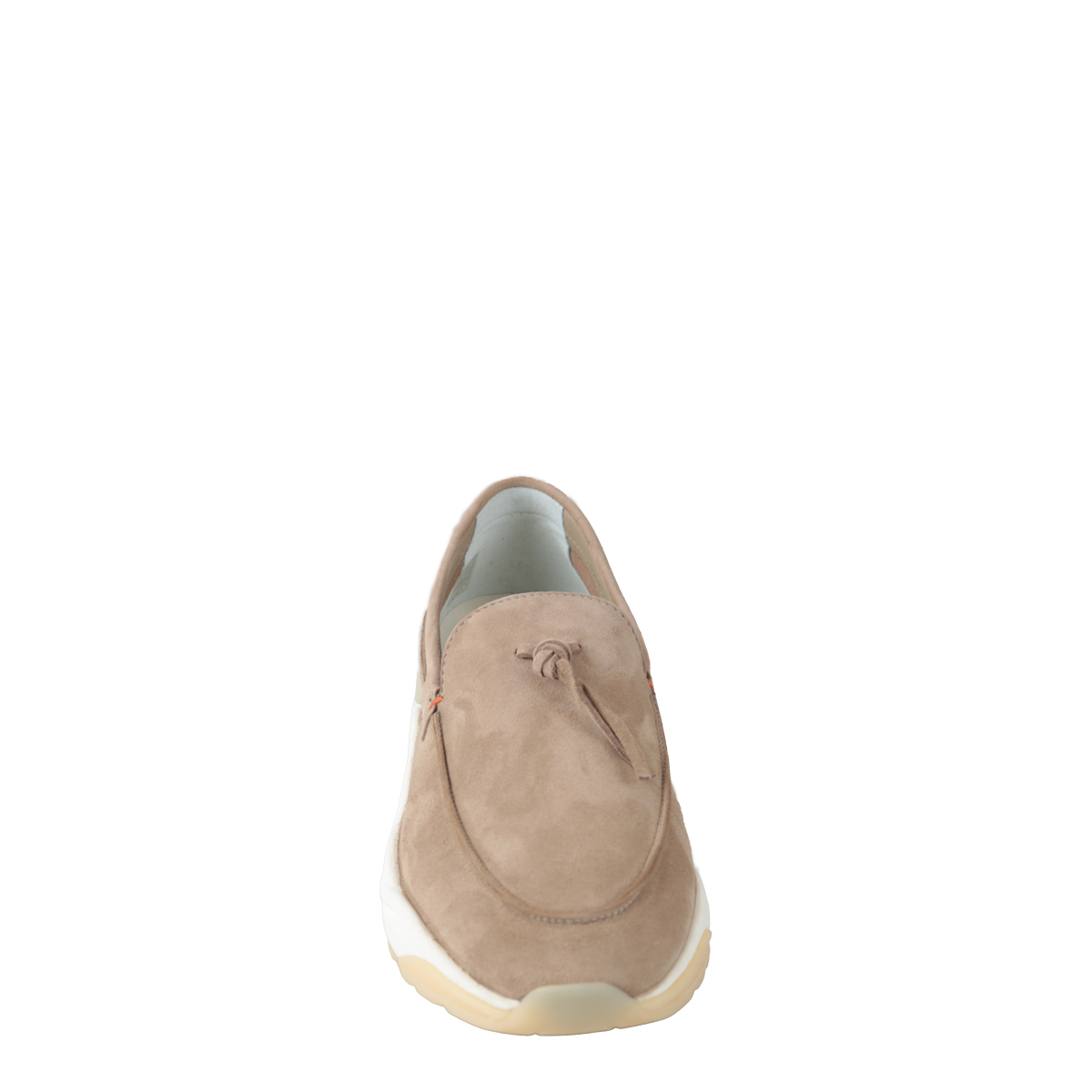 Heren instapper van het Italiaanse merk Santoni. Deze instapper met ronde neus met spiegelnaad uitgevoerd in donkerbeige nabuk. De binnenkant is uitgevoerd in leer en de loopzool is van rubber. Maatadvies: bestel een halve maat kleiner.