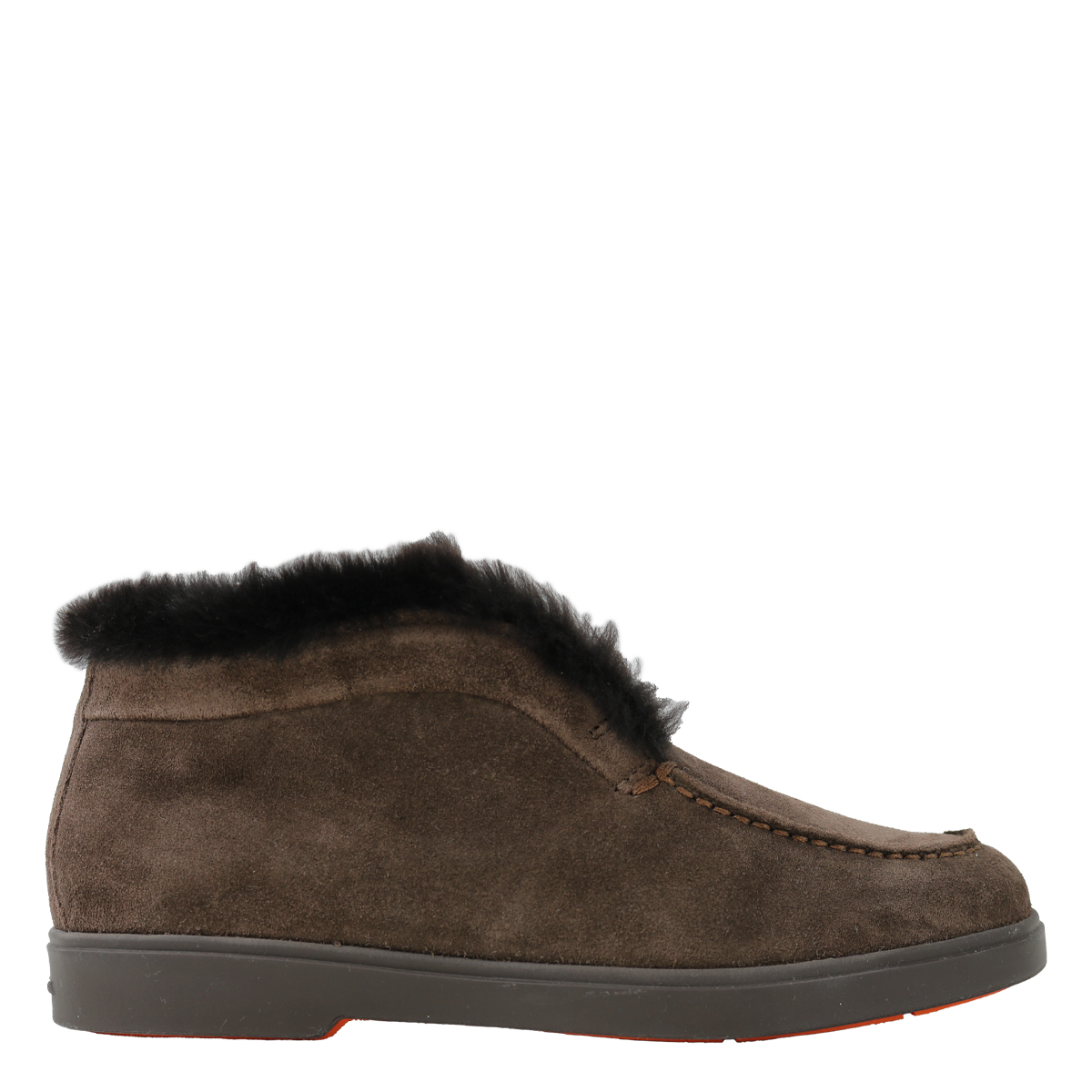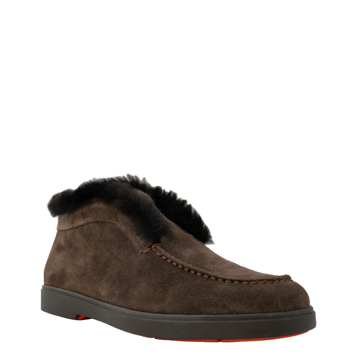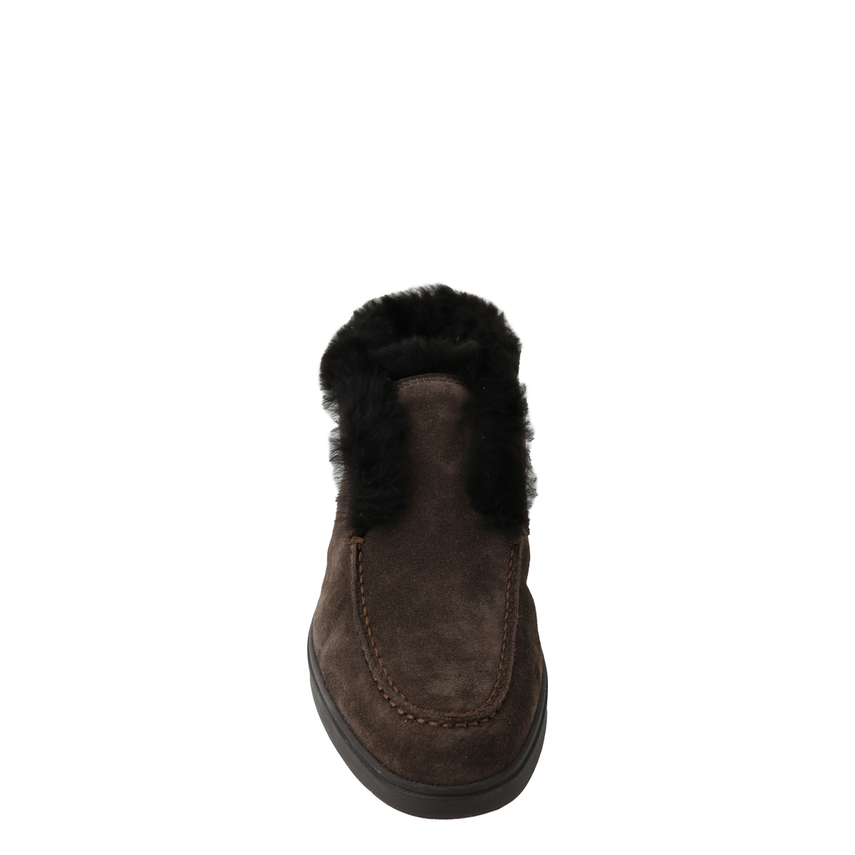 Dames instapper van het merk Santoni. De instapper is uitgevoerd in donkerbruin suede. De binnenzijde is gevoerd en de loopzool is van rubber. Maatadvies: bestel een halve maat kleiner.