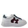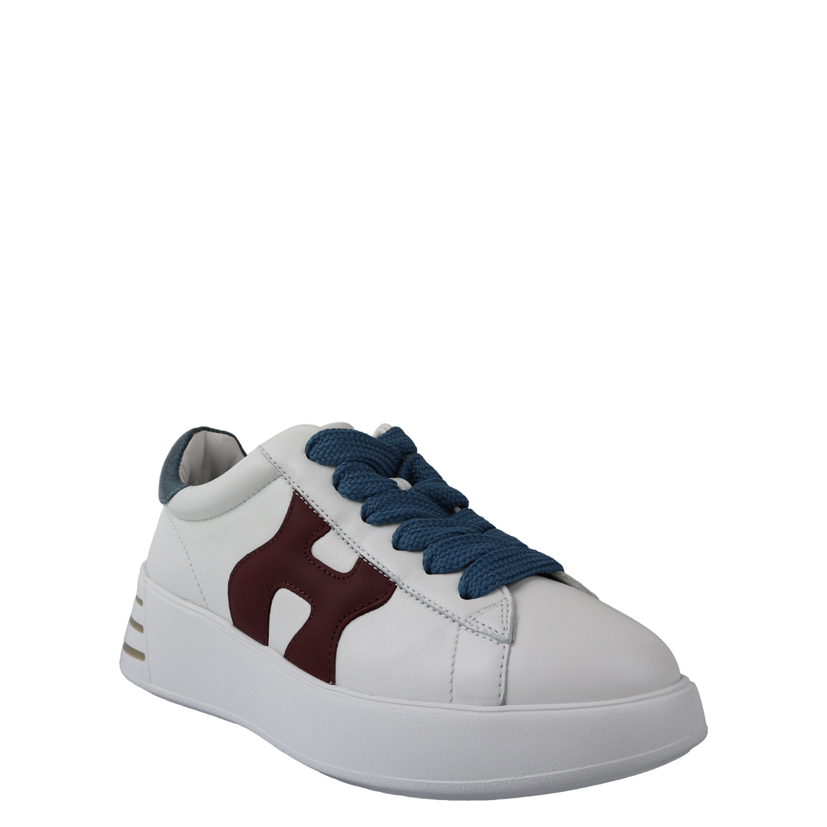 Dames sneaker van het merk Hogan. Deze sneaker is uitgevoerd in wit leer met een bordeaux H en blauwe hiel. Hogan staat bekend om zijn kwalitatieve producten met zijn prachtige tijdloze sneakers. Deze sportieve sneaker is met stof gevoerd, het uitneembare voetbed is te vervangen voor een persoonlijke inlegzool, de loopzool is van rubber. Maatadvies: bestel een halve maat kleiner.