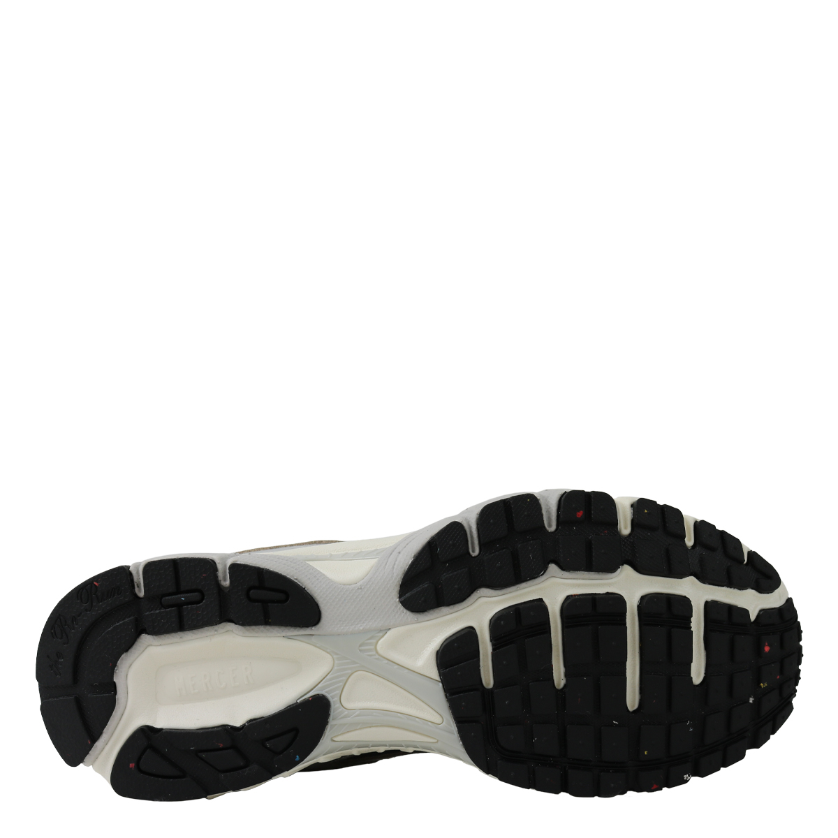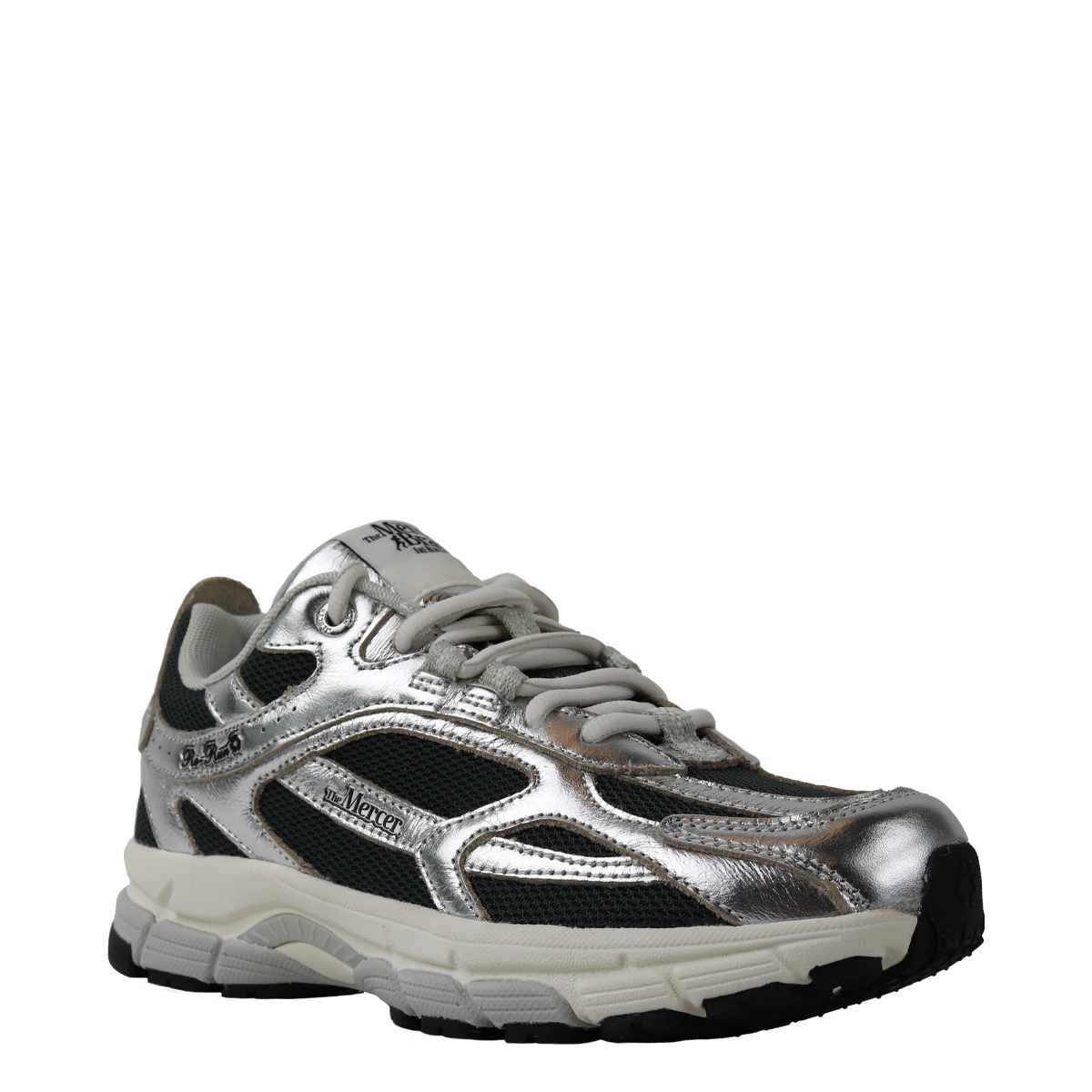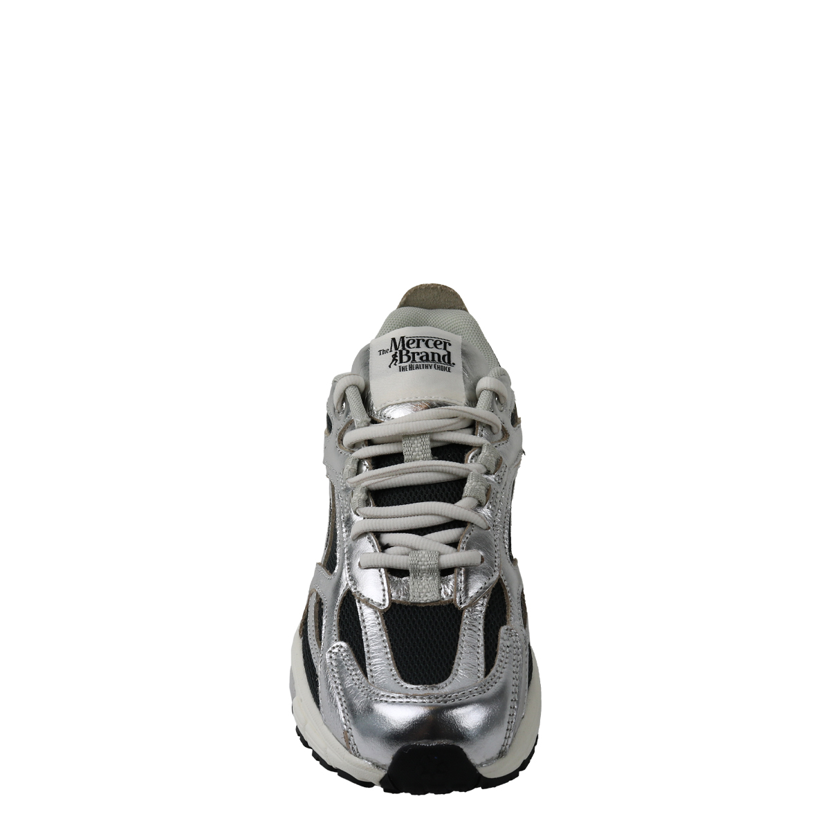 Dames sneaker van het merk Mercer. De sneaker is uitgevoerd in zwart stof en zilver leer. De binnenzijde is uitgevoerd in stof en de loopzool is van rubber. Maatadvies: bestel een maat groter.