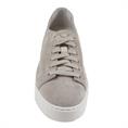 Dames sneaker van het Italiaanse merk Santoni uitgevoerd in taupe suède. Santoni is een exclusief merk wat synoniem staat voor luxe, design en handgemaakt vakmanschap. Deze sneaker met ronde neus, is gemaakt van zeer zacht leer. Het binnenwerk bestaat volledig uit leer en het voetbed is uitneembaar. De witte loopzool is van rubber voor een stevige grip. Maatadvies: bestel een halve maat kleiner.