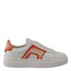 Dames sneaker van het Italiaanse merk Santoni. De sneaker is uitgevoerd in wit leer met oranje details. Santoni is een exclusief merk wat synoniem staat voor luxe, design en handgemaakt vakmanschap. Deze sneaker met ronde neus, is gemaakt van zeer zacht leer. Het binnenwerk bestaat volledig uit leer en het voetbed is uitneembaar. De witte loopzool is van rubber. Maatadvies: bestel een halve maat kleiner.